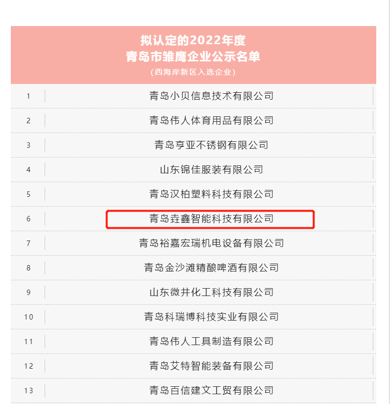 近日,青岛市民营经济发展局公示了2022年度青岛市雏鹰企业拟认定名单,青岛垚鑫智能科技有限公司成功入选。据悉,这是青岛首次培育认定雏鹰企业,全市共486家企业入围2022年度雏鹰企业。此次入选,是青岛市对大力发展创新科技型企业的信号与决心,更是对入选企业的认可与支持。